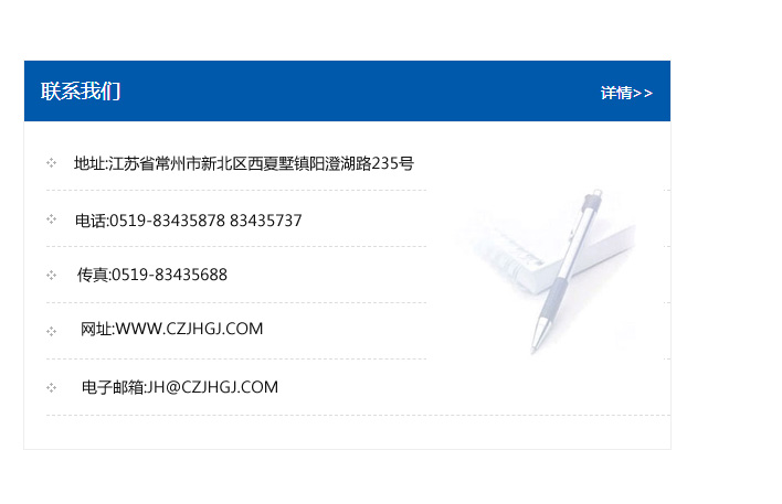 地址:常州市新北區友邦商務大廈1幢16、17層  電話:0519-85101652  傳真:0519-85112595  郵編:213022  網址:www_cz-jiayue_cn.lnddc.com  郵箱:xiajifengaa@163.com